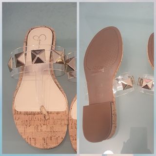 Sandalias planas de la marca Amor amore, talla 39. Son de color beige con tiras transparentes. Ideales para el verano. - Material de la suela: corcho. - Diseño sencillo y elegante. - Perfectas para un look casual.