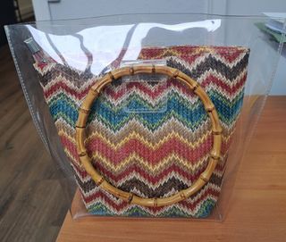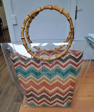 Bolsito que va dentro de otro capazo transparente. Es precioso. Las asas son de bambú (creo). Tiene 3 separadores dentro, uno de ellos es un bolsillo. Tiene cierre con cremallera.