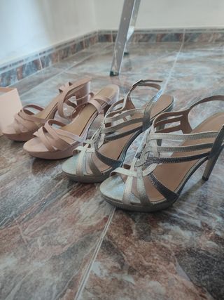 Sandalia plateada tacón fino 4 dedos más 1 dedo de plataforma. Marca Menbur Sandalia terciopelo rosa palo, ligeramente manchada, muy poquito. Tacón delgado de tres dedos más un dedo de plataforma. Marca Maria Mare Sandalias transparentes, con tacón de seis dedos, transparente también. Marca Amor amore