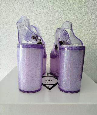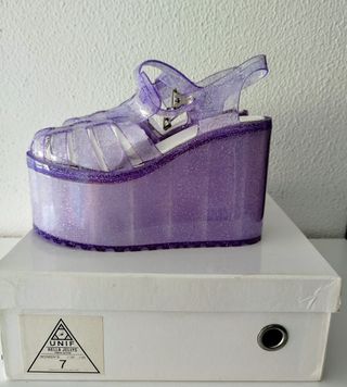 Sandalias marca UNIF Hella Jellys de plataforma, NUEVAS, SIN ESTRENAR. De color morado, lila, violeta, púrpura, talla 37. Son unas sandalias preciosas, con un diseño transparente y brillante. - Únicas ya que están descatalogadas.y es prácticamente imposible encontrarlas. - Estilo cangrejeras. - Plataforma alta. - Material plástico brillante, PVC - Purpurina - Conserva la caja original y las bolsas protectoras. - Una de las sandalias tiene una pequeña mancha de haberlas tenido guardadas, aunque no se aprecia mucho. Costaron lo equivalente a 150€ en Estados Unidos.