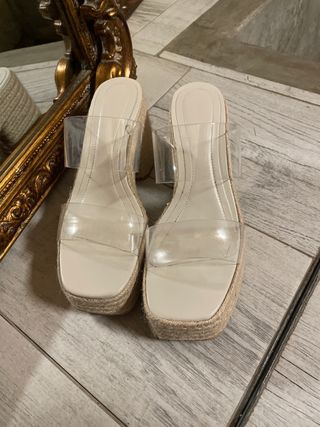 Sandalias plataforma de esparto transparentes de Zara, talla 40. Son ideales para el verano. - Diseño sencillo y elegante. - Material transparente y ligero. - Suela de esparto cómoda.