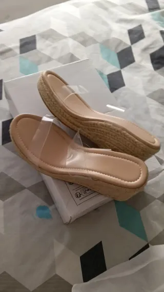 Cuñas nuevas con un diseño moderno y elegante. Perfectas para añadir un toque chic a cualquier atuendo. Cuña de unos 4-5 cent. de alto. - Tiras superiores transparentes. - Suela de esparto. - Cierre de cuña.