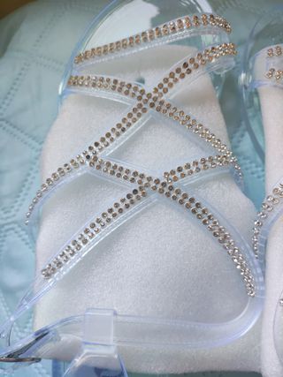 Sandalias romanas elegantes con un diseño único. - Adorno de pedrería. - Tira transparente. - Tacón cuadrado dorado. Me lo he comprado para estas fiestas y me queda grande lo vendo por 20€ está sin estrenar