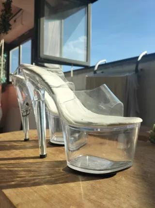 Tacones de plataforma transparentes de la marca Pleaser. - Diseño de tacón alto. - Material acrílico transparente. - Plataforma gruesa para mayor altura. Se hace cambio por otra cosa de valor