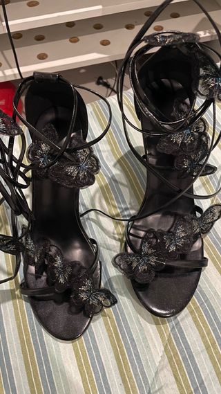 Elegantes sandalias de tacón negras con un delicado diseño de mariposas. - Cierre con cordones. - Detalle de mariposas bordadas. - Tacón transparente. - Solo las usé 1 vez para Halloween en una disco