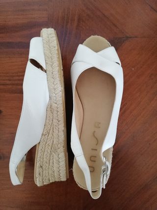 Dos usos, ligeras y cómodas, vendo porque tienen un poquito más de inclinación de lo que estoy acostumbrada pero tanto la plataforma como la cuña son muy cómodas y tiene pulsera en tobillo que sujeta muy bien el pie. Color muy fino y combinable, dorado mate, tipo champán.