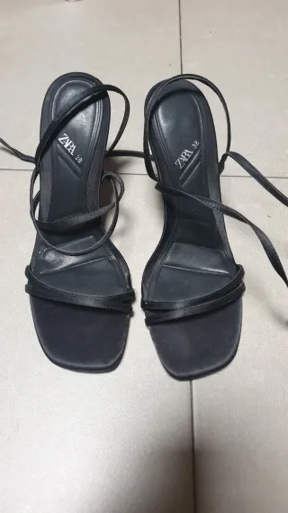 Sandalia de tacón de Zara con dos colores, negro y azul. Puestas una sola vez, es un número 36 pero a mi me queda estrecho. Tacón alto y fino. Cierre de cremallera en el talón.