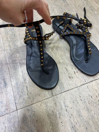 Sandalias planas de Zara con tachas doradas. - Diseño con tiras y detalle de tachas. - Cierre de hebilla. Como nuevas, ideales