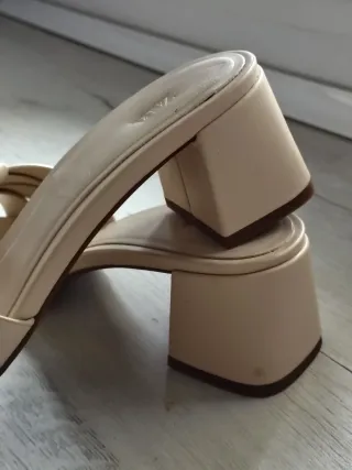 Elegantes sandalias de tacón cuadrado. - Diseño abierto con tiras cruzadas. - Color beige versátil. - Marca ZARA.