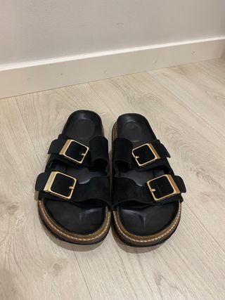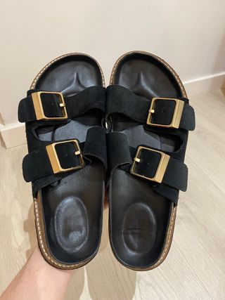 Sandalias de mujer planas estilo Birkenstock de ante en color negro con hevillas doradas. Talla: 41. En buen estado.