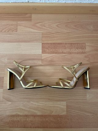 Sandalias de 10cm de talón. Son cómodas y estilizan muchísimo. Preciosas. Color dorado. Talla 37. Las he usado una vez para una boda.