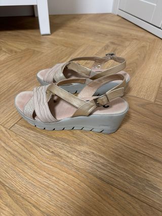 Elegantes sandalias de cuña con un acabado dorado brillante. Perfectas para ocasiones especiales. - Diseño de tiras cruzadas. - Cierre de pulsera. - Plataforma con detalle de esparto.