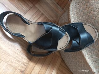 Sandalias de cuña de la marca Zara. Son de color negro y están fabricadas con materiales de ante y madera. - Tienen un diseño de tiras cruzadas. - Ideales para verano. - La madera se oscureció ,pero están nuevas