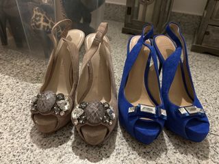 Lote de dos pares de zapatos de fiesta, talla 37. Un par en color beige y otro en azul. - Zapatos destalonados con pedrería. - Zapatos peep-toe con detalle de pedrería.