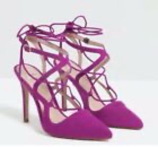 Sandalias de cordones marca Zara. Cierre de hebilla. Color buganvilla. Tacon de 10 cm. Talla 35. Sin estrenar, conserva etiqueta original.