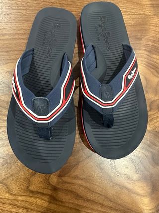 Chanclas de la marca Pepe Jeans con un diseño moderno. - Tira de color azul con detalles en blanco y rojo. - Suela con relieve y logo de la marca. - Detalle de Pepe Jeans London en la suela.