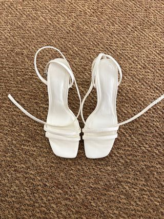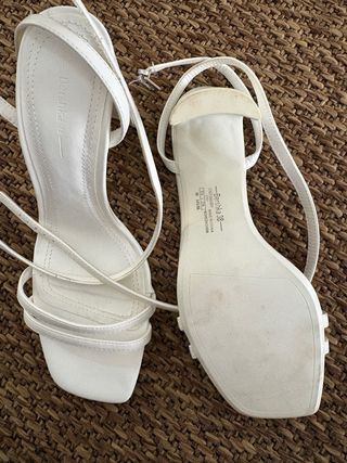 Sandalias de tacón de Bershka en color blanco, usados una vez Se amarran al tobillo, son el número 38