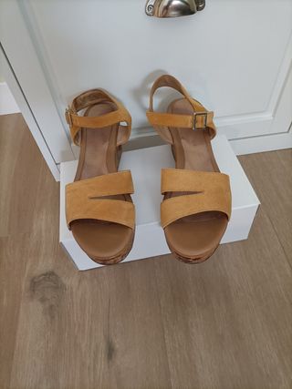 sandalias españolas de la marca Cuplé, de charol en color beis y plataforma. Son muy cómodas. La suela es de goma que amortigua y la hacen antideslizante. actualmente se siguen vendiendo en la web por 69€, puedes consultar el precio. Yo hago oferta porque me urge venderlas. No las he podido estrenar