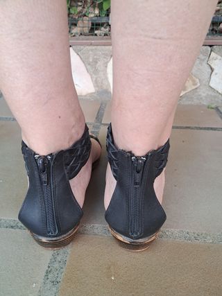 Sandalias negras de tacón bajo. Son elegantes y cómodas, ideales para cualquier ocasión. - Diseño de tiras cruzadas. - Cierre de cremallera en la parte trasera. - Material sintético de aspecto similar al cuero. -con solo 1 uso de menos de 15’