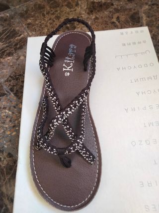 Sandalias planas Kitara en marrón y blanco, talla 40. Son unas sandalias elegantes y cómodas, ideales para el verano. - Diseño de cuerdas trenzadas. - Suela de material resistente. - Perfecto estado.