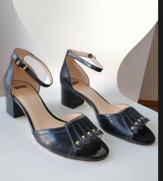 Preciosas sandalias de tacón de la marca MARYPAZ. Son de color negro y tienen un diseño elegante y sofisticado. - Tacón alto y grueso. - Material tipo ante. - Hebilla de cierre en el tobillo. - Perfecto estado,usadas en una sola ocasión.