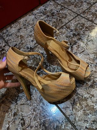 Preciosas sandalias doradas de tacón. Ideales para ocasiones especiales. ✨ - Diseño elegante y sofisticado. - Material brillante y con textura. - Tacón grueso y cómodo. - Se venden dos pares.