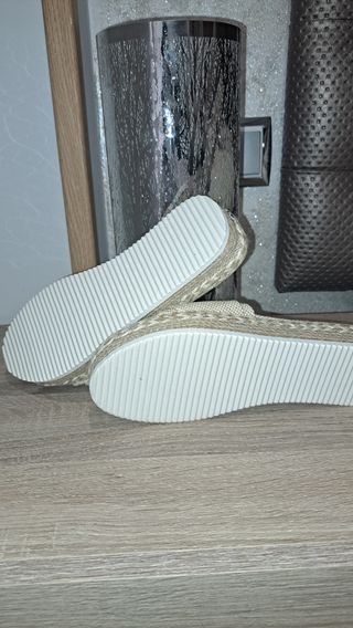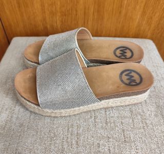 Preciosas sandalias de plataforma con brillantes plateados. Ideales para cualquier ocasión.La suela está un poco desgastada. - Diseño elegante y sofisticado. - Suela de esparto. - Cómodas y fáciles de poner. - Perfectas para el verano.