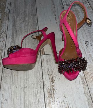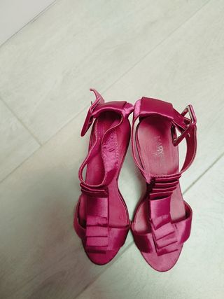 Elegantes sandalias de fiesta en color rosa, perfectas para ocasiones especiales. Solamente las he usado una vez para una boda. Tallan un poco pequeño, equivalente a un 38/38,5. Características: - Diseño con cordones que se atan al tobillo. - Tacón fino para un look sofisticado. - Material de ante. - Incluye tapones de repuesto para el tacón.