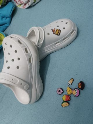 Crocs blancos con un divertido estampado de confeti y estrellas en varios colores. El detalle de la tira amarilla añade un toque vibrante. - Talla 32/33 - Diseño icónico de Crocs. - Tira de talón en color amarillo. - Estampado de confeti y estrellas.