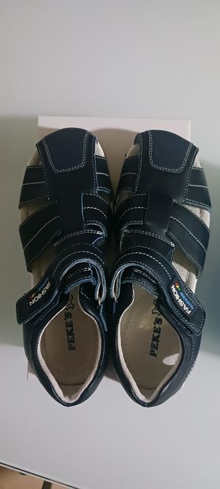 Sandalias de niño Peke's, en color azul marino. Sin estrenar - Fabricadas en piel. - Cierre con velcro. - Suela flexible y cómoda.