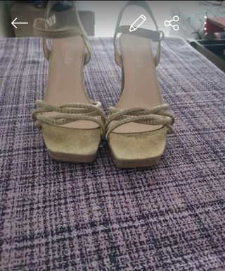 Elegantes sandalias de fiesta con un diseño brillante. Las compré esta temporada de verano 2025 (actualmente siguen en venta), solamente las he usado una vez para una boda. Características: - Tiras adornadas con pedrería. - Tacón cuadrado y plataforma. - Cierre de hebilla ajustable.