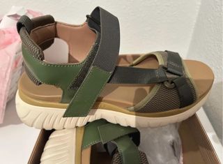 Sandalias Pedro Miralles de mujer, ideales para el verano. Son de color verde oliva y marrón, con tiras de tela y cierre de velcro. Están en muy buen estado, apenas usadas. - Diseño cómodo y ligero. - Material transpirable. - Perfectas para cualquier ocasión.