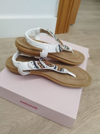 Sandalias de verano, muy cómodas y listas para usar. Son de color blanco y marrón. - Diseño de tiras con detalles de abalorios. - Suela plana de color marrón. - Perfectas para los días calurosos.