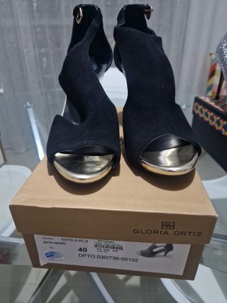 Preciosos botines negros de tacón cuadrado y unas sandalias doradas con purpurina, también de tacón cuadrado. Ideales para cualquier ocasión. - Dos pares de zapatos de mujer. - Los botines son de un material tipo piel sintética. - Las sandalias tienen un diseño elegante y brillante.