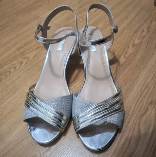 Elegantes sandalias plateadas con un diseño de tiras. Usados solo unas horas en un evento. - Tira ajustable en el tobillo con hebilla. - Tacón de bloque bajo. - Acabado brillante.