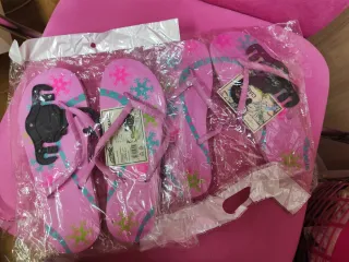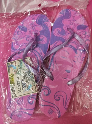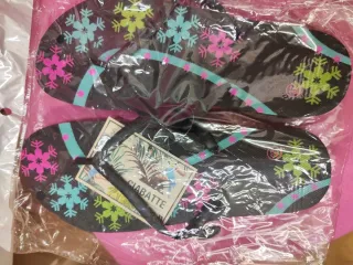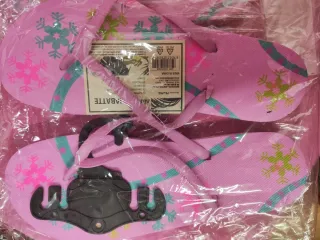 Par de chanclas rosas con un divertido diseño de copos de nieve. Perfectas para un toque de color. - Diseño de copos de nieve en rosa y turquesa. - Tiras finas y cómodas. - Suela con estampado. - varias disponibles - tallas 36-38