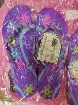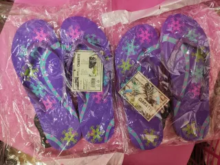 Par de chanclas de dedo con un diseño llamativo. - Base morada con estampado de copos de nieve y detalles en rosa y verde azulado. - Tiras finas en color morado. - Suela con diseño de rayas. - varias tallas disponibles - precio por unidad