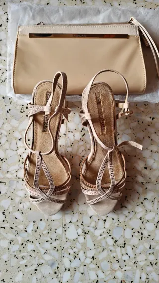 Elegante conjunto de sandalias y bolso. - Sandalias con tiras finas y detalles brillantes. - Bolso tipo clutch con acabado liso y detalle metálico.