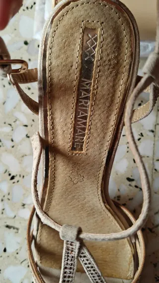 Sandalia de tacón con plataforma, en color camel con tonos dorados. Son muy cómodas y están prácticamente nuevas.