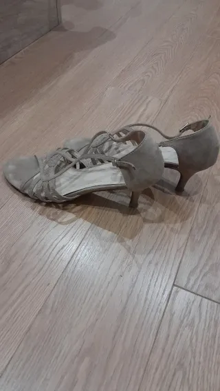 Sandalias de tacon número 39 en color beige. Son de antelina con un diseño elegante y perforado. Están impecables, puestas una sola vez como se puede apreciar en la suela.