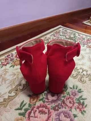 Elegantes sandalias de terciopelo en color rojo. - Tacón grueso. - Tira al tobillo con hebilla. - Adorno fruncido en la pala.