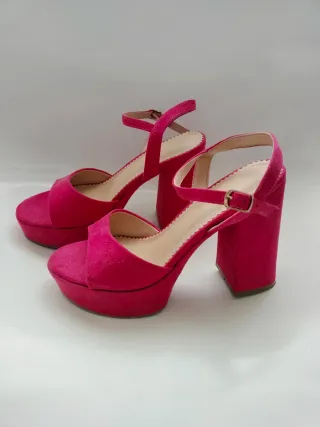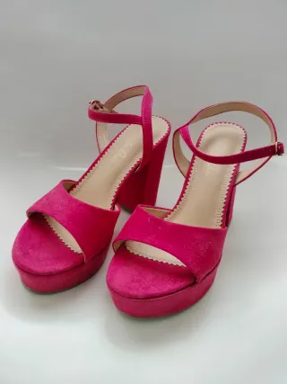 Sandalias de plataforma con un vibrante color rosa. - Diseño de tiras. - Cierre de tobillo con hebilla. - Tacón grueso. - Detalle festoneado en los bordes.