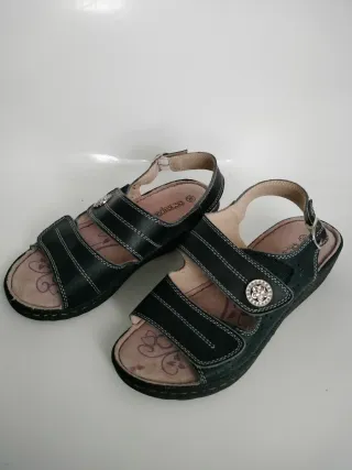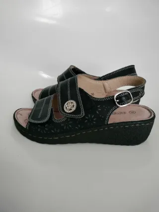 Sandalias de cuña. Fabricadas en Portugal. De piel. Muy ligeras. Solo probadas en casa. Precio original: 59'90€