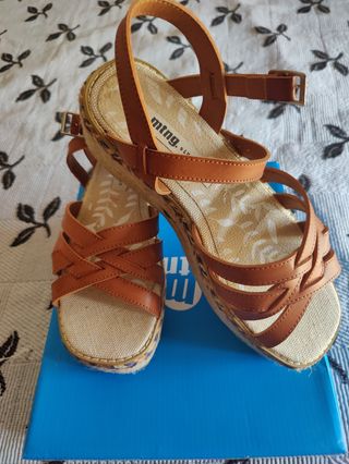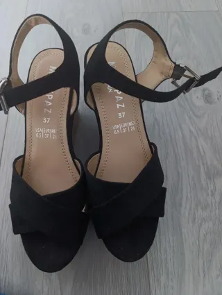Sandalias de cuña de la marca MaryPaz. - Diseño con tiras cruzadas en la parte delantera. - Cierre de hebilla en la tira del tobillo. - Material exterior de ante. Las sandalias se encuentran en perfecto estado. Han tenido poquísimo uso. Se entregan con su caja.
