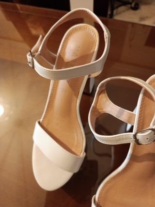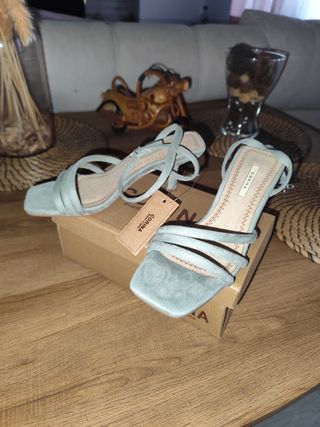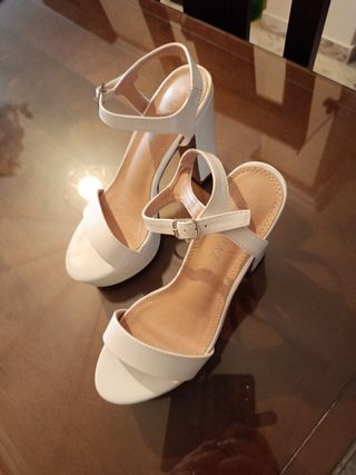 Sandalias de tacón con plataforma de la marca Stradivarius. - Diseño de tiras finas. - Tacón cuadrado y robusto. - Plataforma delantera. - Cierre de hebilla. nueva a estrenar