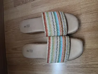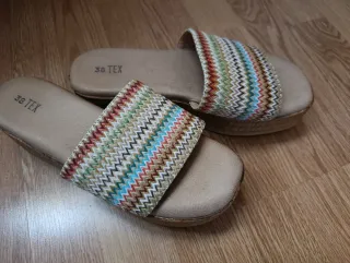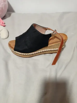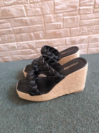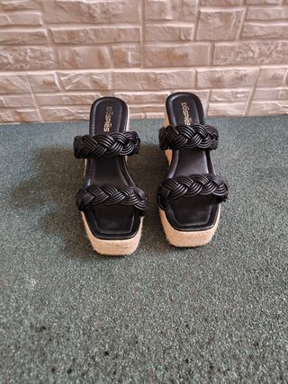 Sandalias de plataforma con detalle de esparto. Diseño abierto. Material de yute en la tira. Suela de plataforma. Sin uso ni defectos. Hago descuentos por lote.