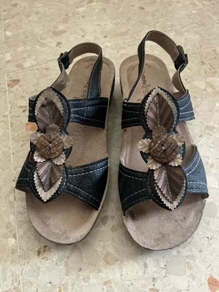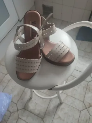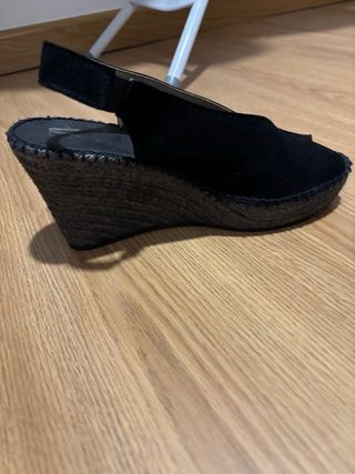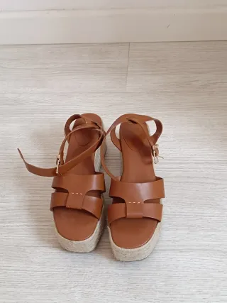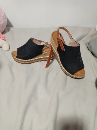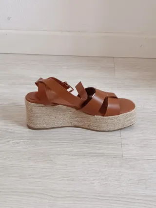 Sandalias de cuña de la marca Castañer. - Diseño cruzado en la pala. - Cierre con pulsera al tobillo. - Plataforma con acabado de esparto. Solo me las he puesto un rato pero me quedan muy justas.