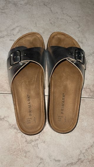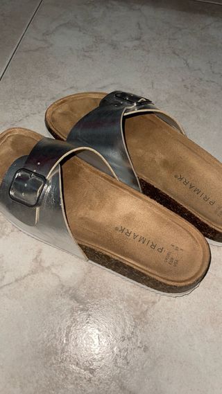 Sandalias de estilo plataforma con un acabado plateado brillante. Son cómodas y versátiles. - Diseño de tira ancha con hebilla ajustable. - Suela de corcho y goma. - Detalle de logo en la plantilla.