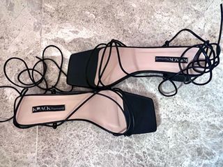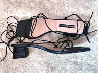 Elegantes sandalias de tacón con tiras finas. - Diseño de tiras que se anudan al tobillo. - Punta cuadrada. - Tacón fino. - Muy cómodas. - Prácticamente nuevas, solo han sido utilizadas en una ocasión.