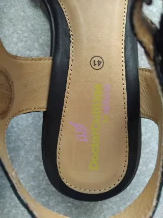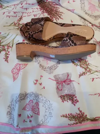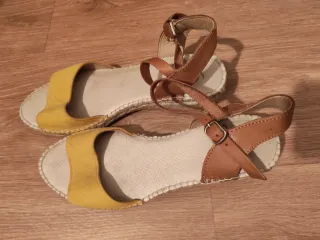 Sandalias de tiras de tela vaquera azul con pespuntes blancos y tiras de polipiel marrones. La primera tira lleva un trocito de goma elástica para mayor comodidad. Con cuñas de esparto. El tacón mide 9 cmts con una plataforma de 2,5 cmts. Talla 41 ( 26 cmts de plantilla). Nuevas sin usar.
